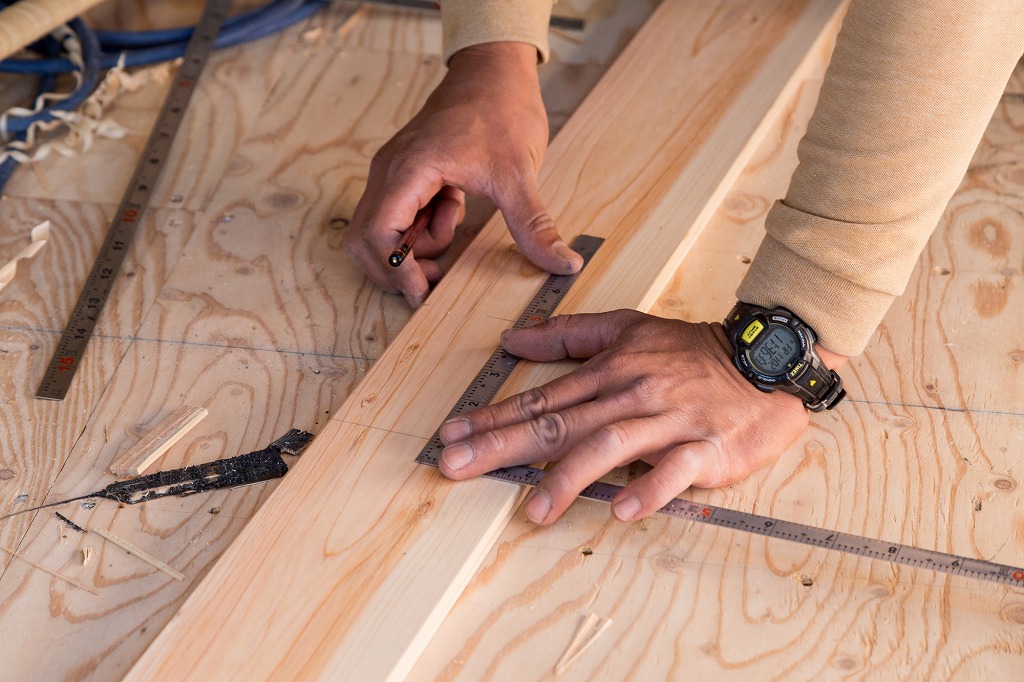 建て込みは加工材とパネルを使用して組み立てる作業工程のことを指します。墨出しで付けた印に合わせて、加工材やパネルを建てていきます。垂直かつ水平に保たなくてはならないため、特に正確性が求められる部分です。ミリ単位のズレもその後の工程に大きく影響するので非常に重要な工程になります。